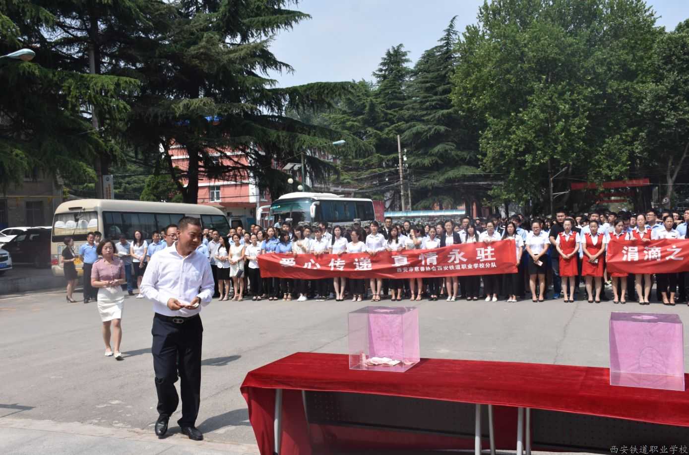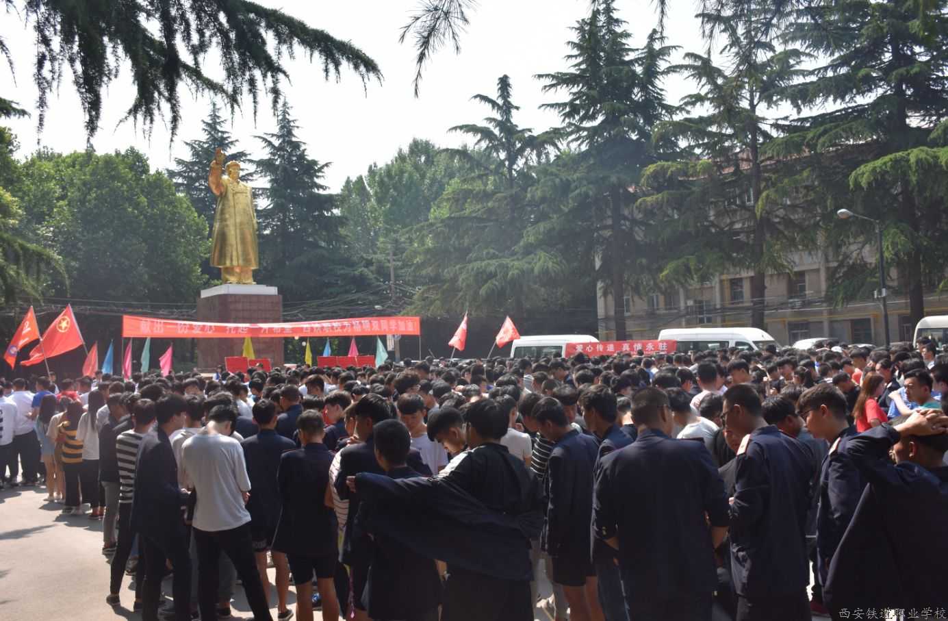 6月13日上午在西安铁道职业学校毛主席雕塑前,学校全体师生进行爱心募捐活动。