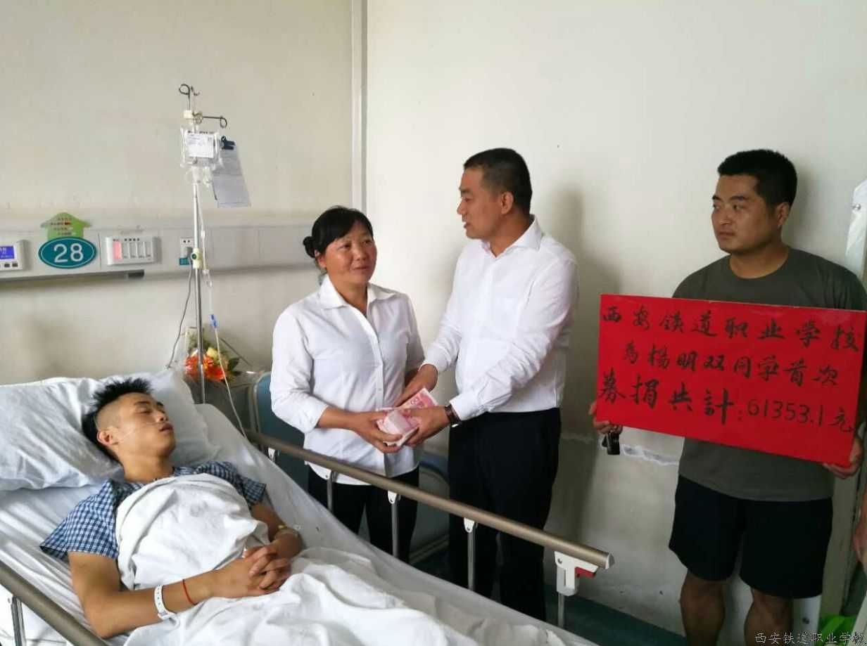 西安铁道职业学校委员会发起捐助活动后,得到了西安铁道职业学校、西安轨道交通技工学校、陕西新纪元烹饪学校5000余名师生的积极响应,大家不争名头,只争捐款,同心同力,为杨明双同学献爱祈福,愿他早日康复!现场共接收捐款61353.1元,最后由陕西宇民教育(集团)副董事长李东霖把善款带到医院,交给受捐助学生家长。