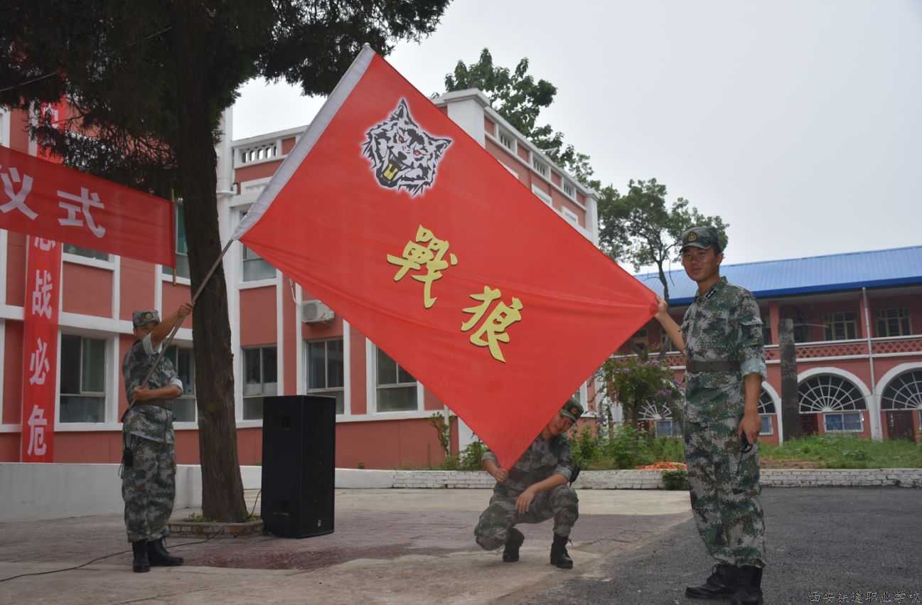 2017年8月19日上午10时,西安铁道职业学校预备役连部隆重集会、红旗猎猎,战旗飞扬,礼炮轰鸣。举行我校战狼学生军训基地成立暨挂牌仪式。